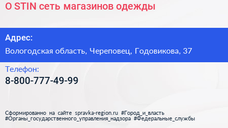 O`STIN, сеть магазинов одежды по адресу Вологодская область, Череповец, Годовикова, 37 в дальнейшем Организация, размещена в следующих категориях: