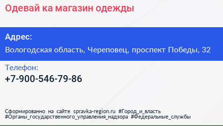 Одевай-ка, магазин одежды по адресу Вологодская область, Череповец, проспект Победы, 32 в дальнейшем Организация, размещена в следующих категориях: