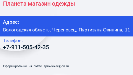 Планета, магазин одежды по адресу Вологодская область, Череповец, Партизана Окинина, 11 в дальнейшем Организация, размещена в следующих категориях: