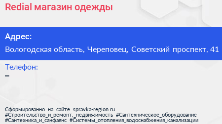 Redial, магазин одежды по адресу Вологодская область, Череповец, Советский проспект, 41 в дальнейшем Организация, размещена в следующих категориях: