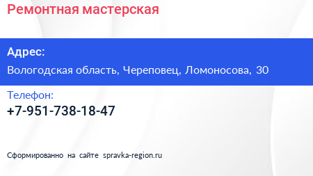 Ремонтная мастерская по адресу Вологодская область, Череповец, Ломоносова, 30 в дальнейшем Организация, размещена в следующих категориях: