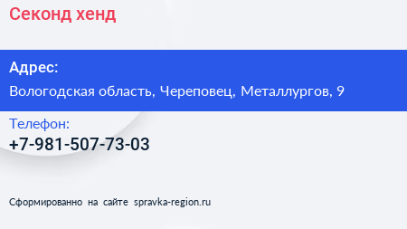 Секонд-хенд по адресу Вологодская область, Череповец, Металлургов, 9 в дальнейшем Организация, размещена в следующих категориях: