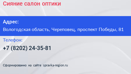 Сияние, салон оптики по адресу Вологодская область, Череповец, проспект Победы, 81 в дальнейшем Организация, размещена в следующих категориях: