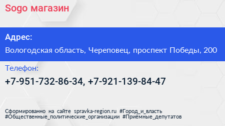 Sogo, магазин по адресу Вологодская область, Череповец, проспект Победы, 200 в дальнейшем Организация, размещена в следующих категориях: