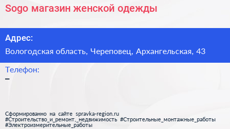 Sogo, магазин женской одежды по адресу Вологодская область, Череповец, Архангельская, 43 в дальнейшем Организация, размещена в следующих категориях: