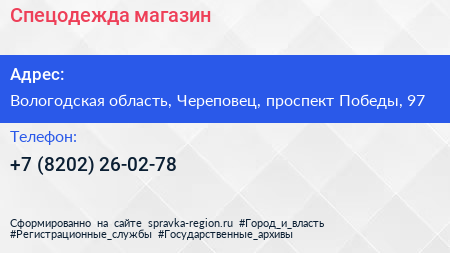 Спецодежда, магазин по адресу Вологодская область, Череповец, проспект Победы, 97 в дальнейшем Организация, размещена в следующих категориях: