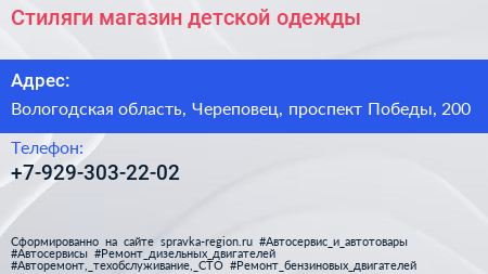 Стиляги, магазин детской одежды по адресу Вологодская область, Череповец, проспект Победы, 200 в дальнейшем Организация, размещена в следующих категориях: