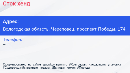 Сток-хенд по адресу Вологодская область, Череповец, проспект Победы, 174 в дальнейшем Организация, размещена в следующих категориях: