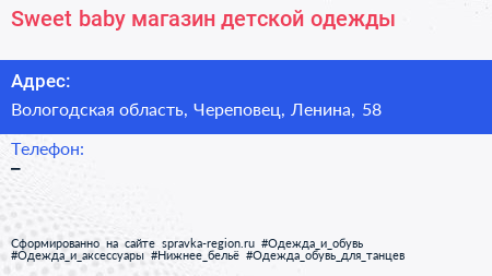 Sweet baby, магазин детской одежды по адресу Вологодская область, Череповец, Ленина, 58 в дальнейшем Организация, размещена в следующих категориях: