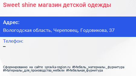Sweet shine, магазин детской одежды по адресу Вологодская область, Череповец, Годовикова, 37 в дальнейшем Организация, размещена в следующих категориях: