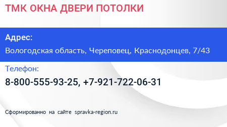 ТМК ОКНА ДВЕРИ ПОТОЛКИ по адресу Вологодская область, Череповец, Краснодонцев, 7/43 в дальнейшем Организация, размещена в следующих категориях: