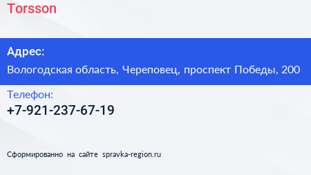 Torsson по адресу Вологодская область, Череповец, проспект Победы, 200 в дальнейшем Организация, размещена в следующих категориях: