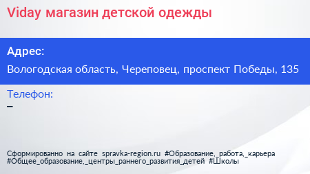 Viday, магазин детской одежды по адресу Вологодская область, Череповец, проспект Победы, 135 в дальнейшем Организация, размещена в следующих категориях: