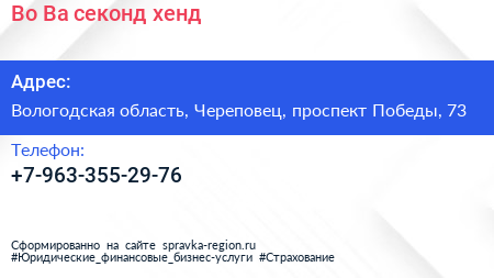 Во!Ва!, секонд-хенд по адресу Вологодская область, Череповец, проспект Победы, 73 в дальнейшем Организация, размещена в следующих категориях: