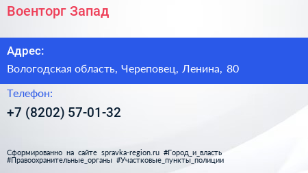 Военторг-Запад по адресу Вологодская область, Череповец, Ленина, 80 в дальнейшем Организация, размещена в следующих категориях: