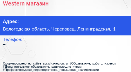 Western, магазин по адресу Вологодская область, Череповец, Ленинградская, 1 в дальнейшем Организация, размещена в следующих категориях: