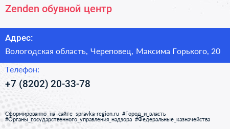 Zenden, обувной центр по адресу Вологодская область, Череповец, Максима Горького, 20 в дальнейшем Организация, размещена в следующих категориях: