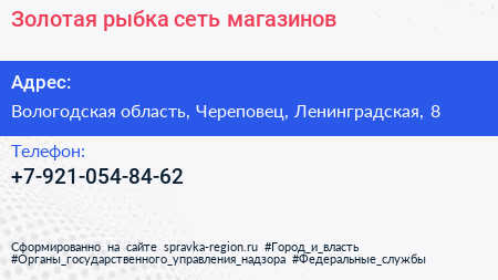 Золотая рыбка, сеть магазинов по адресу Вологодская область, Череповец, Ленинградская, 8 в дальнейшем Организация, размещена в следующих категориях: