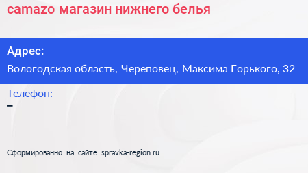 camazo, магазин нижнего белья по адресу Вологодская область, Череповец, Максима Горького, 32 в дальнейшем Организация, размещена в следующих категориях: