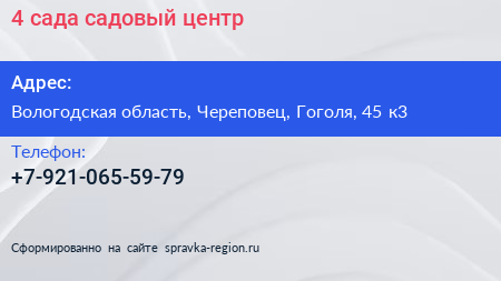 4 сада, садовый центр по адресу Вологодская область, Череповец, Гоголя, 45 к3 в дальнейшем Организация, размещена в следующих категориях: