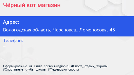Чёрный кот, магазин по адресу Вологодская область, Череповец, Ломоносова, 45 в дальнейшем Организация, размещена в следующих категориях: