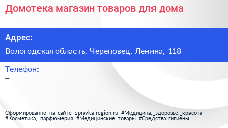 Домотека, магазин товаров для дома по адресу Вологодская область, Череповец, Ленина, 118 в дальнейшем Организация, размещена в следующих категориях: