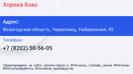 Хорека Бокс по адресу Вологодская область, Череповец, Набережная, 45 в дальнейшем Организация, размещена в следующих категориях: