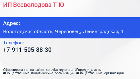 ИП Всеволодова Т.Ю. по адресу Вологодская область, Череповец, Ленинградская, 1 в дальнейшем Организация, размещена в следующих категориях: