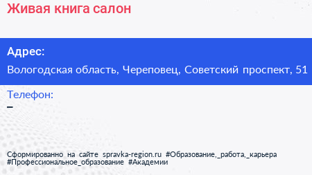 Живая книга, салон по адресу Вологодская область, Череповец, Советский проспект, 51 в дальнейшем Организация, размещена в следующих категориях:
