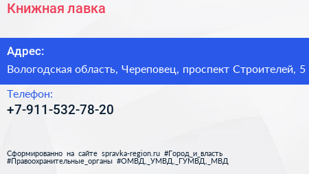 Книжная лавка по адресу Вологодская область, Череповец, проспект Строителей, 5 в дальнейшем Организация, размещена в следующих категориях: