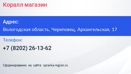 Коралл, магазин по адресу Вологодская область, Череповец, Архангельская, 17 в дальнейшем Организация, размещена в следующих категориях: