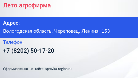 Лето, агрофирма по адресу Вологодская область, Череповец, Ленина, 153 в дальнейшем Организация, размещена в следующих категориях: