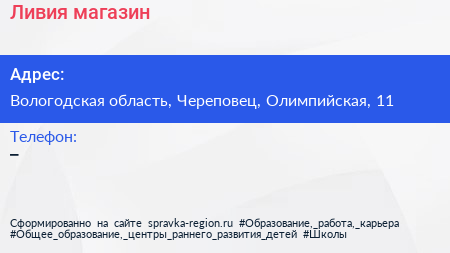 Ливия, магазин по адресу Вологодская область, Череповец, Олимпийская, 11 в дальнейшем Организация, размещена в следующих категориях: