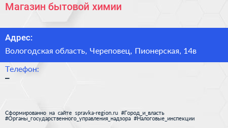 Магазин бытовой химии по адресу Вологодская область, Череповец, Пионерская, 14в в дальнейшем Организация, размещена в следующих категориях: