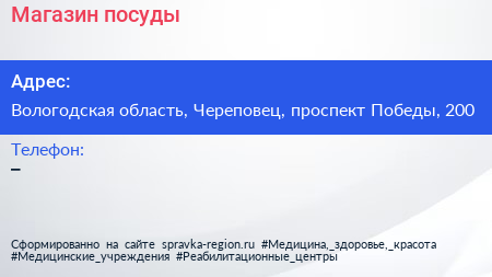 Магазин посуды по адресу Вологодская область, Череповец, проспект Победы, 200 в дальнейшем Организация, размещена в следующих категориях:
