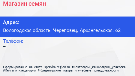 Магазин семян по адресу Вологодская область, Череповец, Архангельская, 62 в дальнейшем Организация, размещена в следующих категориях: