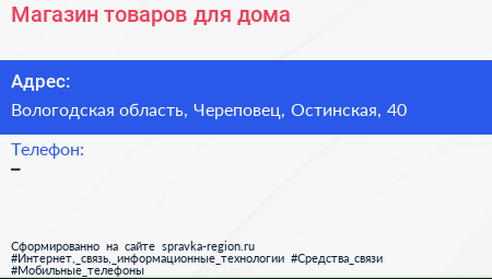 Магазин товаров для дома по адресу Вологодская область, Череповец, Остинская, 40 в дальнейшем Организация, размещена в следующих категориях: