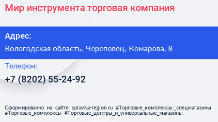 Мир инструмента, торговая компания по адресу Вологодская область, Череповец, Комарова, 8 в дальнейшем Организация, размещена в следующих категориях: