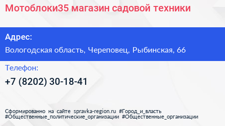Мотоблоки35, магазин садовой техники по адресу Вологодская область, Череповец, Рыбинская, 66 в дальнейшем Организация, размещена в следующих категориях: