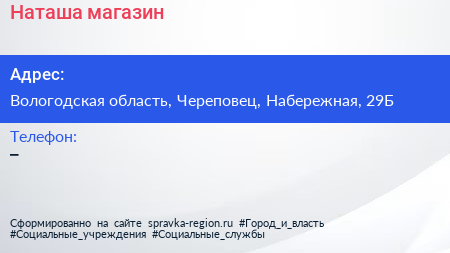 Наташа, магазин по адресу Вологодская область, Череповец, Набережная, 29Б в дальнейшем Организация, размещена в следующих категориях: