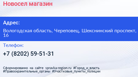 Новосел, магазин по адресу Вологодская область, Череповец, Шекснинский проспект, 16 в дальнейшем Организация, размещена в следующих категориях:
