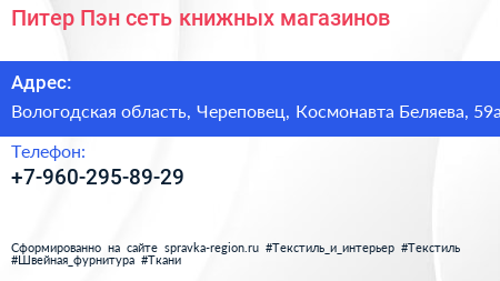 Питер Пэн, сеть книжных магазинов по адресу Вологодская область, Череповец, Космонавта Беляева, 59а в дальнейшем Организация, размещена в следующих категориях: