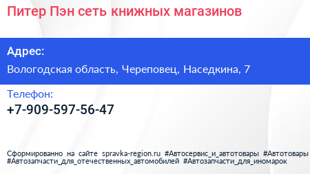Питер Пэн, сеть книжных магазинов по адресу Вологодская область, Череповец, Наседкина, 7 в дальнейшем Организация, размещена в следующих категориях: