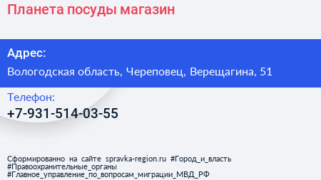 Планета посуды, магазин по адресу Вологодская область, Череповец, Верещагина, 51 в дальнейшем Организация, размещена в следующих категориях: