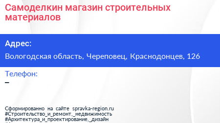 Самоделкин, магазин строительных материалов по адресу Вологодская область, Череповец, Краснодонцев, 126 в дальнейшем Организация, размещена в следующих категориях: