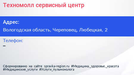 Техномолл, сервисный центр по адресу Вологодская область, Череповец, Любецкая, 2 в дальнейшем Организация, размещена в следующих категориях: