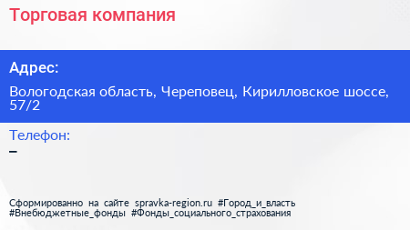 Торговая компания по адресу Вологодская область, Череповец, Кирилловское шоссе, 57/2 в дальнейшем Организация, размещена в следующих категориях: