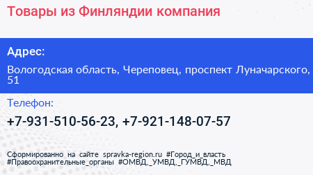 Товары из Финляндии, компания по адресу Вологодская область, Череповец, проспект Луначарского, 51 в дальнейшем Организация, размещена в следующих категориях: