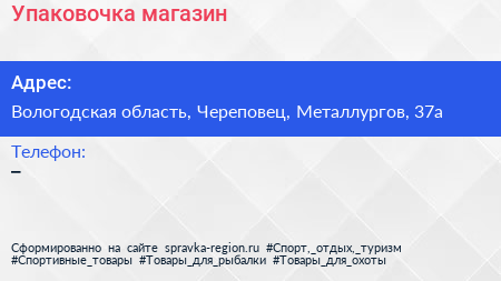 Упаковочка, магазин по адресу Вологодская область, Череповец, Металлургов, 37а в дальнейшем Организация, размещена в следующих категориях: