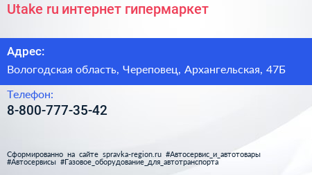 Utake.ru, интернет-гипермаркет по адресу Вологодская область, Череповец, Архангельская, 47Б в дальнейшем Организация, размещена в следующих категориях: